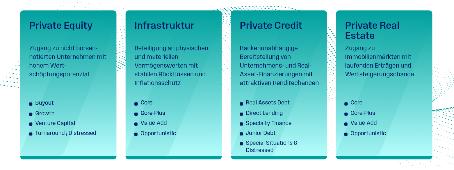 Als aktiver Asset Manager investieren wir bereits seit Jahrzehnten erfolgreich in alle Private Markets-Segmente: