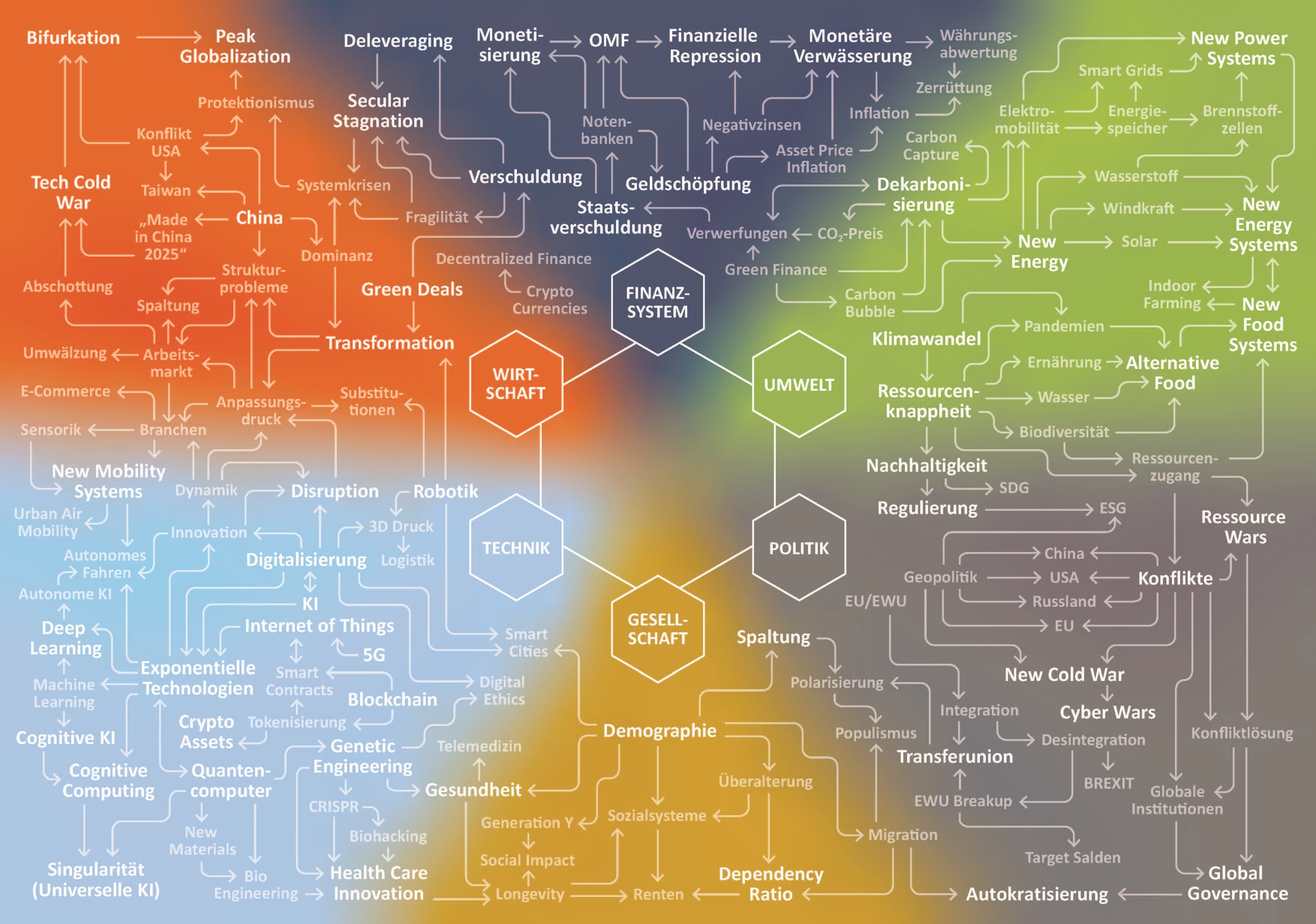 Trends erkennen und analysieren, die unsere Welt von morgen prägen – das ist die Mission des FERI Cognitive Finance Institute. Als strategischer Think Tank der FERI haben wir stets unabhängig vom schnelllebigen Kapitalmarktgeschehen das große Ganze im Blick. Im Fokus stehen langfristige Entwicklungen und Megatrends, die das Zukunftsbild stark beeinflussen werden – interdisziplinär analysiert in sechs Erkenntnisräumen: Finanzsystem, Umwelt, Politik, Gesellschaft, Technik und Wirtschaft.