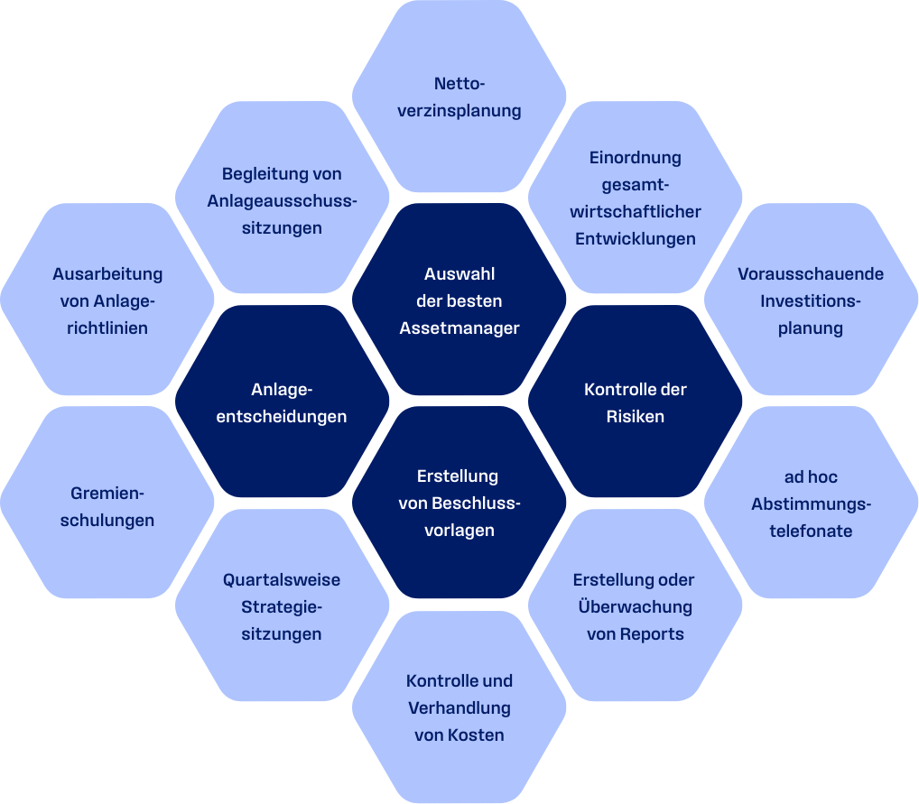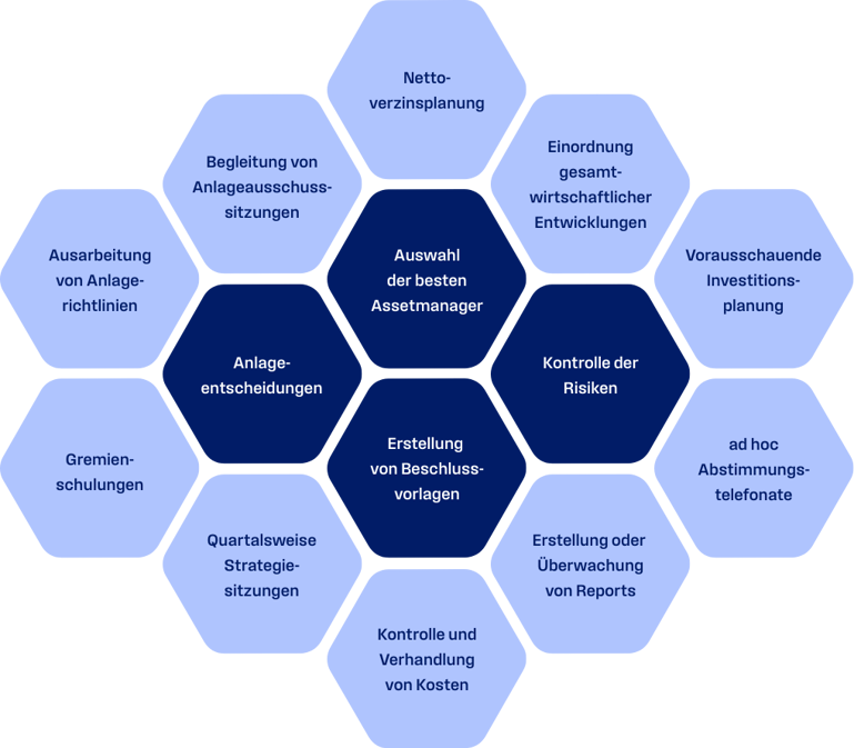 Unsere professionelle Beratung deckt sämtliche Bereiche der institutionellen Kapitalanlage ab, darunter Asset Allocation, Asset Liability Management (ALM), Managerauswahl, Controlling und Reporting sowie Nachhaltigkeitskriterien. Klar strukturierte Beschlussvorlagen fassen alle wichtigen Informationen für Sie zusammen und sorgen für Transparenz.