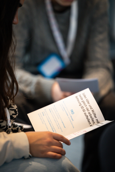 In der ersten Runde ging es um das Thema Geschlechtergerechtigkeit (SDG5). Unter dem Motto „Mama, Papa, Arbeit – was ist fair?“ setzten sich die Jugendlichen kritisch mit Rollenbildern, Care-Arbeit und der Verantwortung von Politik und Unternehmen auseinander.