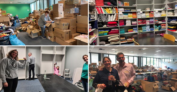 Alle FERIanerinnen und FERIaner konnten während ihrer Arbeitszeit verschiedene Hilfsaktionen aktiv unterstützen. So haben einige in Bad Homburg in der im März eingerichteten Kleiderkammer im Impfzentrum der Hochtaunuskliniken geholfen, die überwältigende Flut von Sachspenden zu sortieren oder von uns gestiftete Regale aufzubauen und zu befüllen. Insgesamt kamen hier rund 100 freiwillige Arbeitsstunden zusammen. Und wir finden, das Ergebnis kann sich sehen lassen!