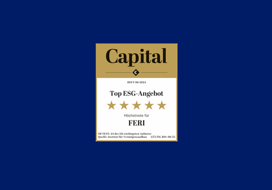 Das Wirtschaftsmagazin Capital hat FERI erneut mit der Höchstnote von fünf Sternen als besten unabhängigen Vermögensverwalter im Bereich Nachhaltigkeit ausgezeichnet.